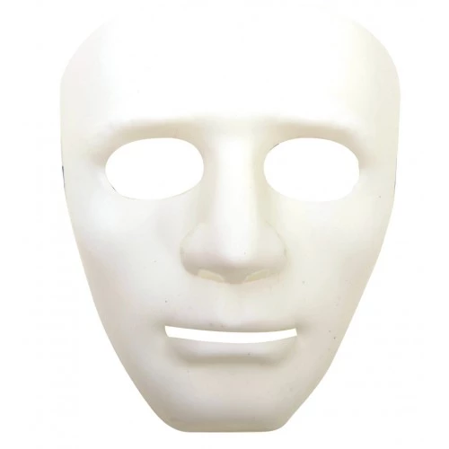 Hard wit plastic dik masker in de vorm van een serieus kijkend mannen gezicht. Met een breed elastiek om te doen. Dit uitdrukkingsloze masker wordt veel verkocht tijdens Halloween