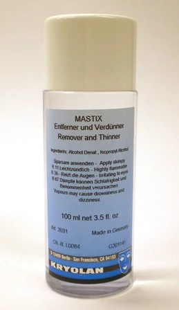 Deze verwijderaar is voor de gewone mastiek of voor de mastiek TV. Niet alleen voor de huid, maar ook het baardmateriaal o.i.d. kunt u hiermee schoon maken. Kryolan produkt. 100 cc. Ook is dit middel te gebruiken als mastiekverdunner. Wat ingedikte mastiek krijgt u hiermee weer vloeibaar.