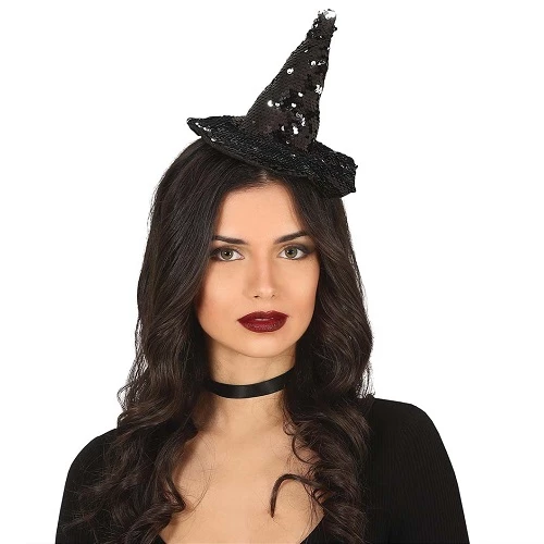 Leuk glitterend klein heksenhoedje op een diadeem. De heksen hoed heeft reversible pailletten in het zwart en zilver. One size, past altijd. Zowel bij volwassen als kinderen.