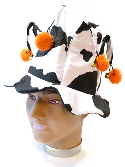Narachtige hoge hoed in koeienprint met oranje balletjes. Gemaakt van mooie geprinte stof. Ziet er goed uit. Een plaatje! Met belletjes! En…ook nog eens een koopje voor zo’n mooie hoed.