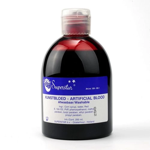 Prachtig mooi bloed van Superstar. Dit bloed is heel praktisch, want het stolt snel. Het komt vloeibaar uit de fles en je kan het heel makkelijk direct opbrengen. Het kan een klein beetje weglopen, maar daarne stolt het en blijft het keurig zitten. Word natuurlijk nooit helemaal droog. Is zeer makkelijk af te wassen van de huid en ook uit de meeste kleding, maar daarmee moet je toch altijd uitkijken. Deze fles van een kwart liter bevat de lichtere soort bloed. Zeer realistisch.