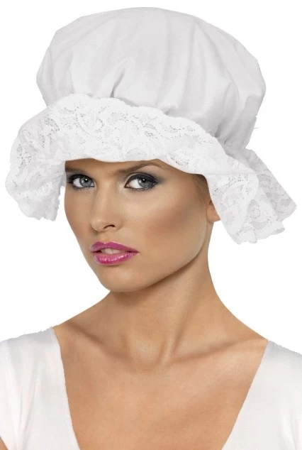 Wit mutsje met een kanten randje dat voor heel veel doeleinden is geschikt. Hij kan goed voor een middeleeuwse marktkoopvrouw, een omaatje, grootmoeder wolf, Ot en Sien of Oktoberfest dame.