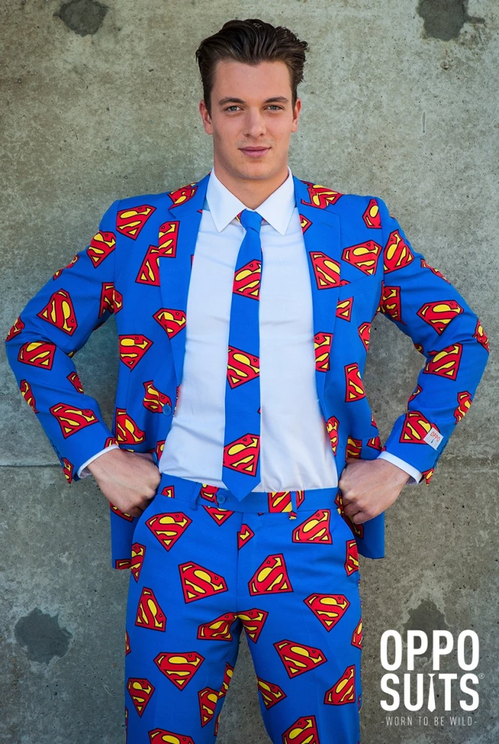 Bedrijfsfeestjes bij de Daily Planet zullen nooit meer hetzelfde zijn dankzij dit officiele Superman pak van OppoSuits. Of dit pak je ook daadwerkelijk superkrachten geeft weten we niet, maar we geven je wel een garantie op een supersterke look. Verkrijgbaar in verschillende herenmaten. Kijk even in het menu voor de beschikbare maten op dit moment.
