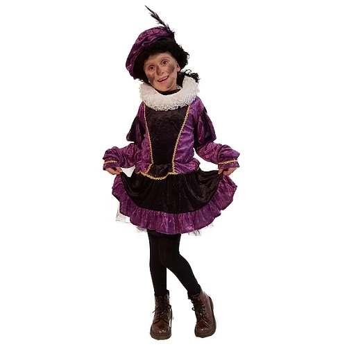 Mooi jurkje voor een kinder Pietje. Gemaakt van elastisch velours de panne en afgewerkt met goudband en een tulle rand onder het rokje. Het Pietenpakje heeft mooie lange mouwen en is aan en uit te doen door middel van een rits op de rug. Inclusief baret met veertje, exclusief kraag. Verkrijgbaar in verschillende maten en kleuren.