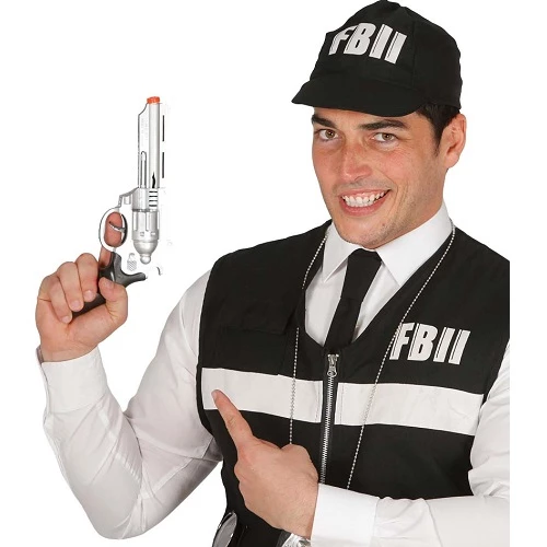Plastic politie pistool van wel 28cm lang. Zonder klappertjes of electrisch geluid, maar met een bang als je de trekker overhaalt.