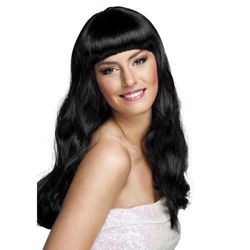 Deze zwarte lange pruik heeft stijl lang haar tot over de schouders en een mooie ietwat naar binnen gekrulde pony. De pruik is mooi vol en in deze zwarte kleur goed te gebruiken als bijvoorbeeld heksenpruik.