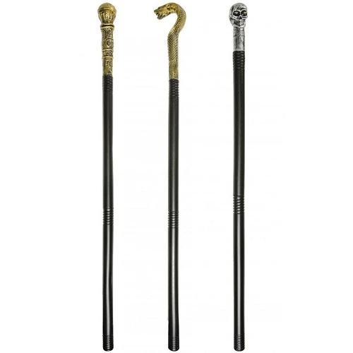Zwarte pooierstok met een gouden knop, een zilveren schedel of een gouden slang. De wandelstok is 3-delig dus makkelijk op te bergen of ergens mee naar toe te nemen. In elkaar te zetten doormiddel van schroefdraad.