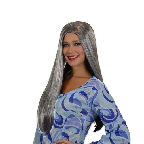 Een pruik met lang grijs stijl haar en een scheiding in het midden. Goed om te gebruiken als heksenpruik of als oma pruik. Het grijze haar zit gestikt op een elastische hoofdkap die altijd past op een volwassen hoofd.