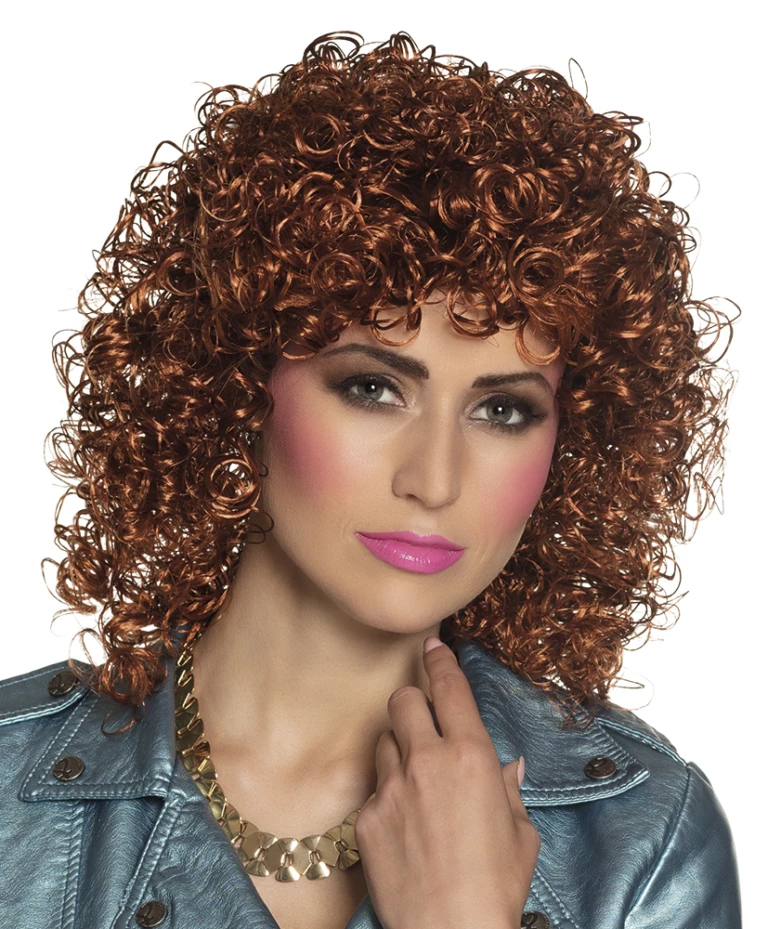 Leuke bruine pruik met weelderige krullen. De krullen hebben een beetje een vettige look wat deze pruik tot een perfecte jaren 80 pruik maakt. Deze bruine pruik met krullen is voorzien van een elastische hoofdkap waardoor hij altijd goed past.