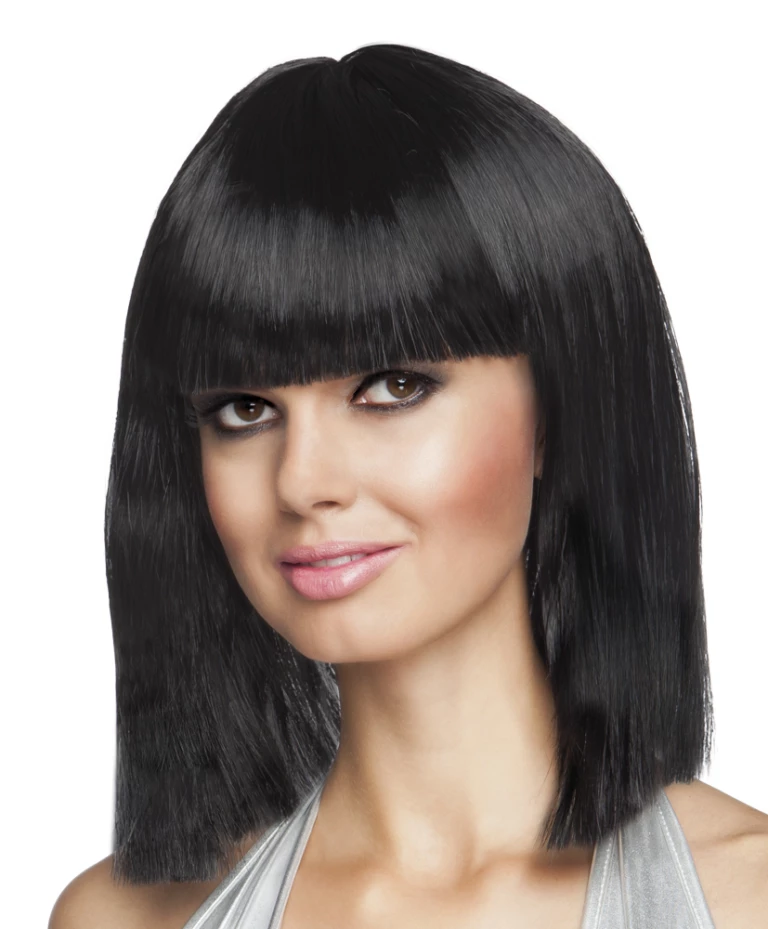Mooie korte zwarte boblijn pruik met een elastische binnenkap. Deze bobline pruik is iets langer dan ons andere model bobline pruik en door de bot geknipte pony heeft dit model ook iets weg van een Cleopatra kapsel. Maar de modellen in de felle neon kleurtjes zijn te gek voor elk disco, neon of 80ties feest. Ook perfect voor Mia Wallace uit Pulp fiction.