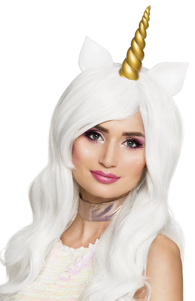 Prachtige witte eenhoorn pruik met heel vol haar. De hoorn is van latex is is vastgemaakt aan de pruik. De pruik heeft een schuine pony en lang haar. Echt een magische pruik. :
