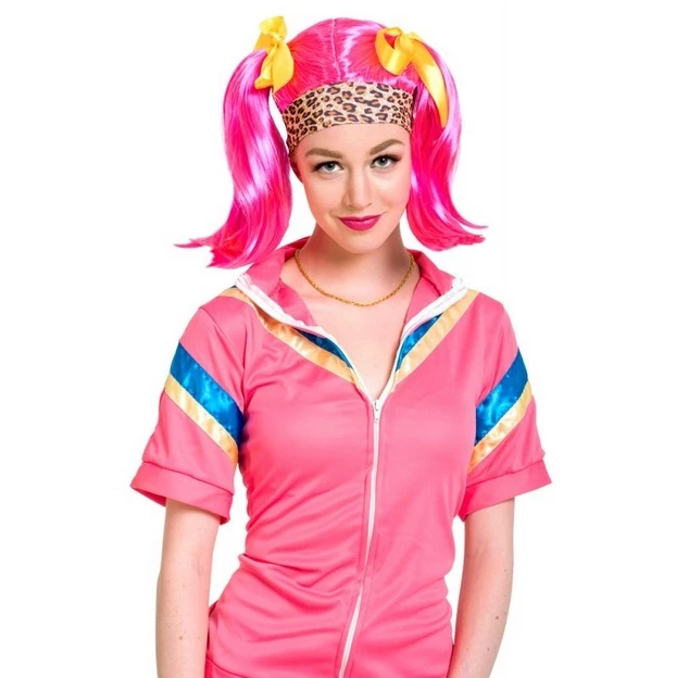 Oftewel, laat me zweten! Leuke pruik die het goed doet bij een fitness outfit. Deze pruik heeft een aangehechte zweetband in luipaard dessin en met twee volle dikke roze staarten.