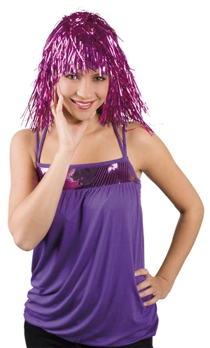 Leuk futuristisch of disco stijl. Een metallic pruikje. Kort tot op de schouders, glimmende draadjes op een luchtig kapje.