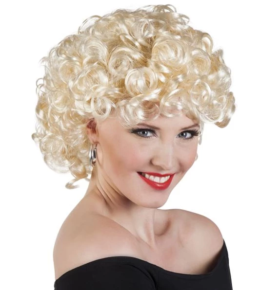 Altijd al Olivia Newton John als Sandy uit Grease willen zijn? Dat kan met deze blonde Sandy pruik. Geknoopt op een ruime hoofdkap, dus past altijd.