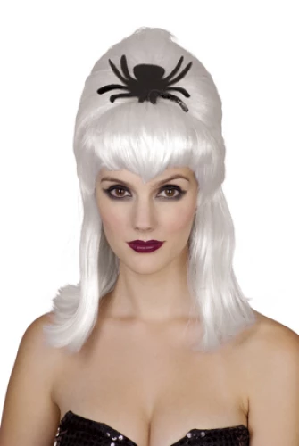 Witte heksenpruik, hoog model met een dikke pony. Half lang haar en in het midden een grote zwarte spin.