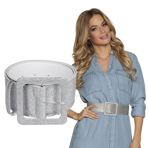 Zilveren glitter riem. 120cm lang en 5,5cm breed. Leuk voor een disco of glitter en glamout feestje.