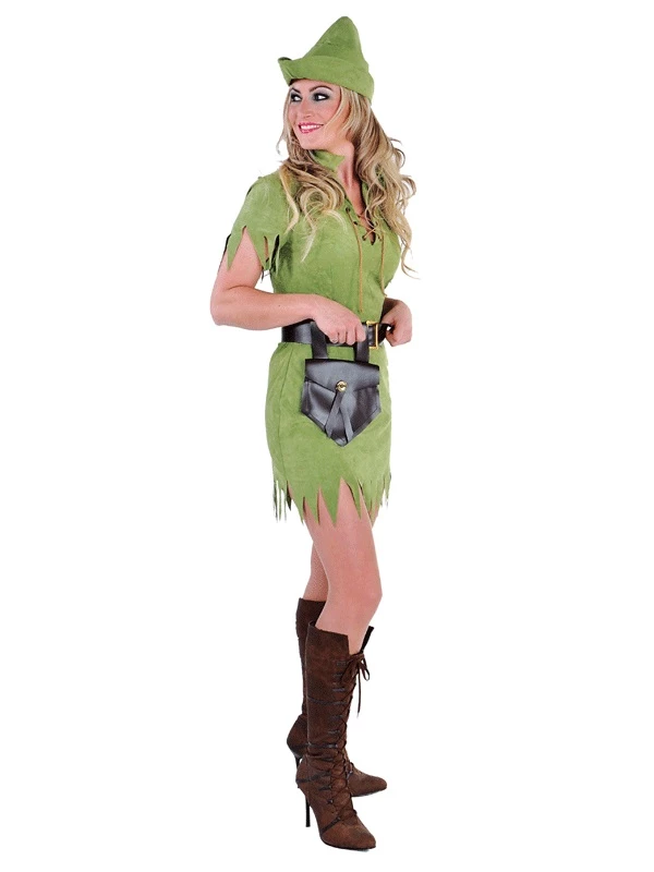 Super leuk jurkje van de vrouwelijk Robin Hood. Inclusief riem met tasje en een mutsje. Het jurkje is gemaakt van een soort imitatie velours, een beetje harig materiaal dus. Heel erg leuk. Verkrijgbaar in diverse dames maten.