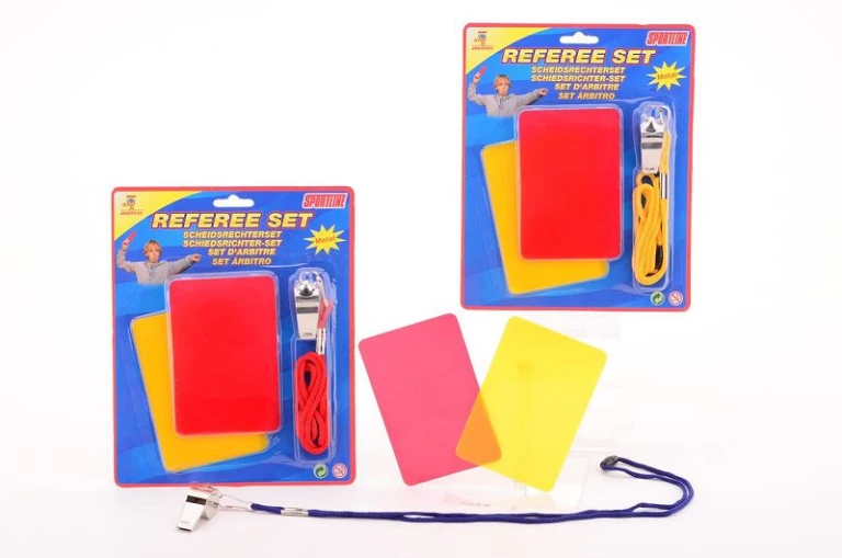 Scheidsrechter set met een rode kaart en een gele kaart en fluitje.