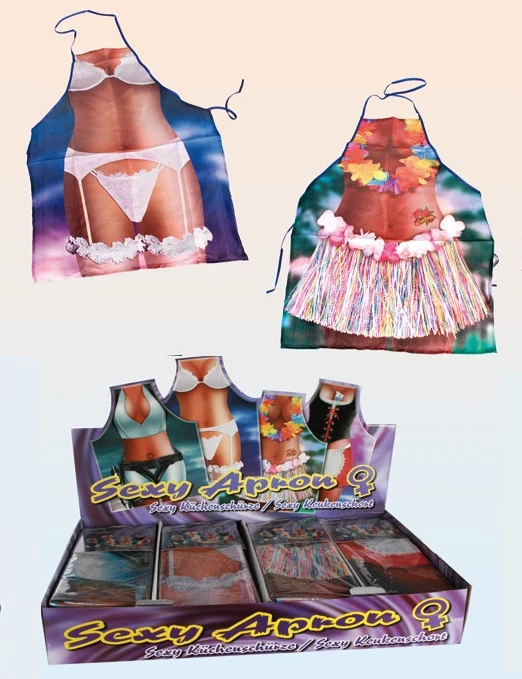 Keukenschort met een print van een vrouwenlijf. Verkrijgbaar in vier verschillende printjes. Een Tiroler dame met een dirndl, een Hawaiiaanse en een Tomb Raider typje. Alleen deze 2 zijn leverbaar