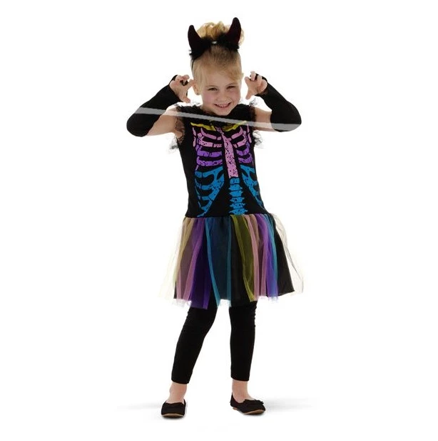 Heel erg leuk en hip skeletten jurkje met neon kleurtjes. Inclusief haaraccessoire, armstukken en beenwarmers. Verkrijgbaar in verschillende kindermaten. Kijk even in het rolmenu voor de beschikbare maten.