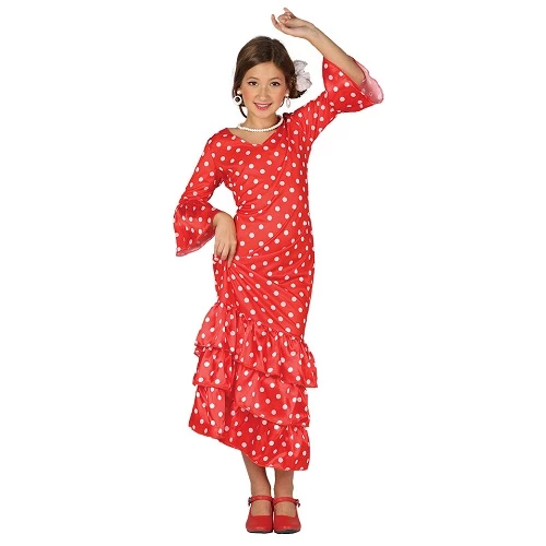 Licht elastische rode Spaanse jurk met witte stippen. Verkrijgbaar in verschillende kindermaten. 7-9 jaar valt ongeveer als 128 en 10-12 jaar valt ongeveer als 140.
