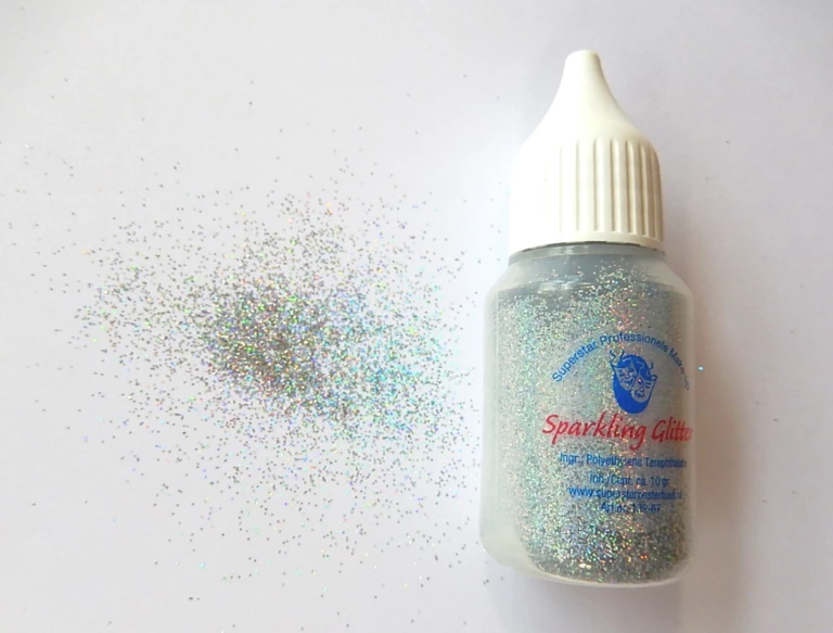 Dit is ongeveer 10 gram glitter in een spuitflaconnetje. Kan overal op aangebracht worden, zoals bijv. op de nog vochtige schmink, in het haar of direct op de huid met een beetje vettigheid. Het is een droge glitter en laat zich heel makkelijk verwerken in de make up. Niet direct boven het oog aanbrengen, want als er een glittertje in je oog valt, kan je daar last van hebben, al is het onschadelijk, want het is een niet scherpe kunststof. De glitter is altijd een klein beetje gemixt van kleur, maar dit potje geeft duidelijk een zilver uitstraling.