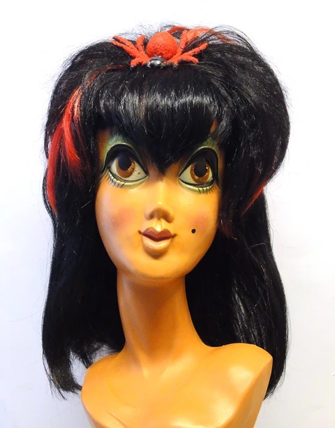 Een echte enge heksenpruik in zwart met rode strepen. Om het af te maken zit er midden op het hoofd een griezelige grote spin.