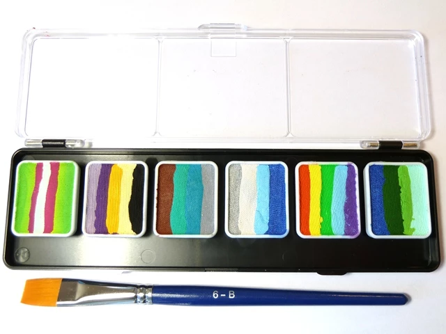 Splitcake is een schmink op waterbasis waarmee je meerdere kleuren in é:é:n streek op het gezicht kunt zetten. Je kunt met een breed penseel (speciaal splitcake penseel) alle kleuren in é:é:n keer opzetten, maar met een smaller penseel kunt je ook bijvoorbeeld maar twee of drie kleuren in é:é:n keer gebruiken. Met deze techniek kun je prachtige vlinders maken, maar ook hele mooie effecten creë:ren boven de ogen. Het is even oefenen, maar dan heb je ook wat. Dit palet heeft 6 verschillende combinaties: 1middengroen/lichtgroen/roze/wit 2 lavendel/paars/geel/cré:me/zwart 3 bruin/turqoise/grijs-blauw/grijs 4 zilver/parelmoer/lichtblauw/donkerblauw 5 rood/geel/middengroen/lichtblauw/donkerblauw 6 donkerblauw/donkergroen/middengroen/cré:me.