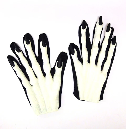 Zwarte stretch handschoenen met latex spook handen. De rubberen witte handen zijn 3D en op de zwarte handschoenen geplakt. Door het soepele latex kun je je vingers gewoon nog bewegen. One size. Voor volwassenen of grote kinderen.