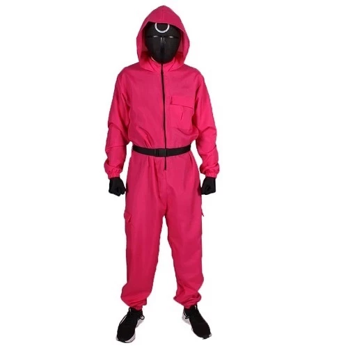 Het populaire donkerroze pak uit de Netflix hitserie Squid game. Het kostuum bestaat uit een roze overall (niet rood zoals Casa de papel), zwarte handschoenen en een zwarte riem. Het squid game pak komt inclusief capuchon maar ZONDER masker. Deze zijn los bij ons te koop.