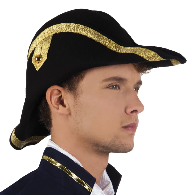 Mooie steek afgewerkt met goudband. One size, ongeveer hoedenmaat 59. U kunt hem met de punt naar voren opzetten, maar ook naar de zijkanten.