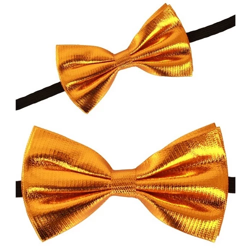 Glimmende gouden strik van stof. Met een verstelbaar elastieken halskoortje.