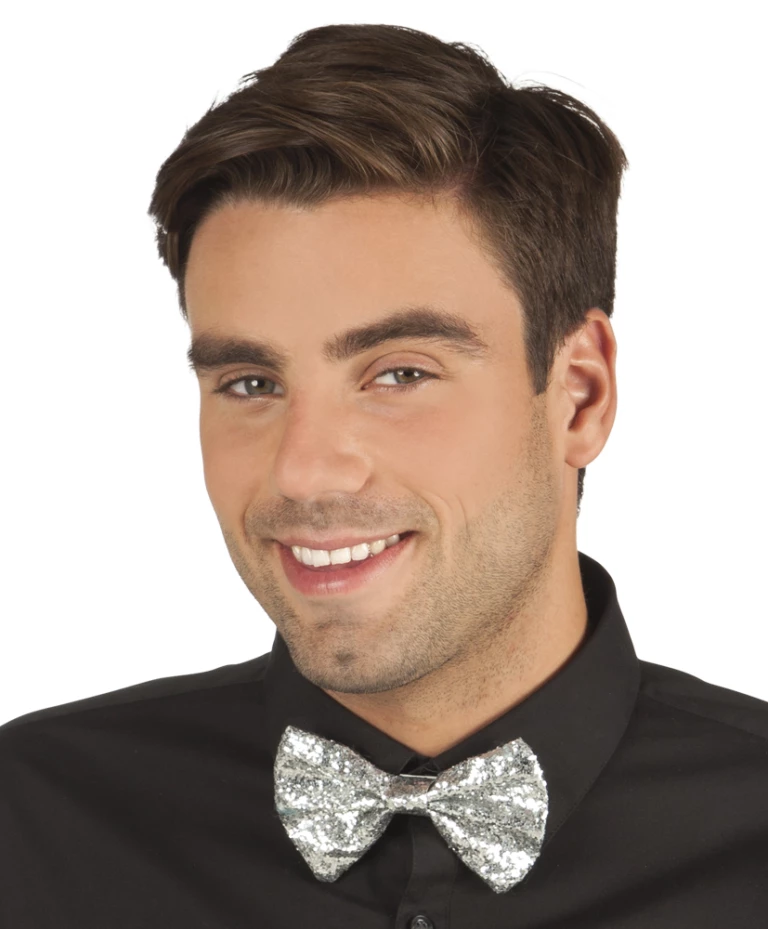 Sprankelende glitter zilveren vlinderdas die met een elastiekje is om te doen.