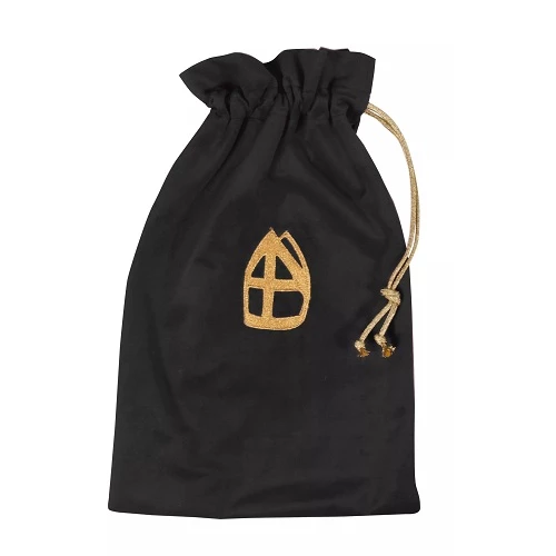 Mooie luxe strooizak in een prachtige zwarte kleur. Gemaakt van imitatie fluweel dus past perfect bij fluwelen Pieten pakken. De gouden mijter is geen bedrukking, maar echt gestikt. De zak heeft een afmeting van 30 x 48 cm. Er zit een gouden trekkoord aan om hem te sluiten.