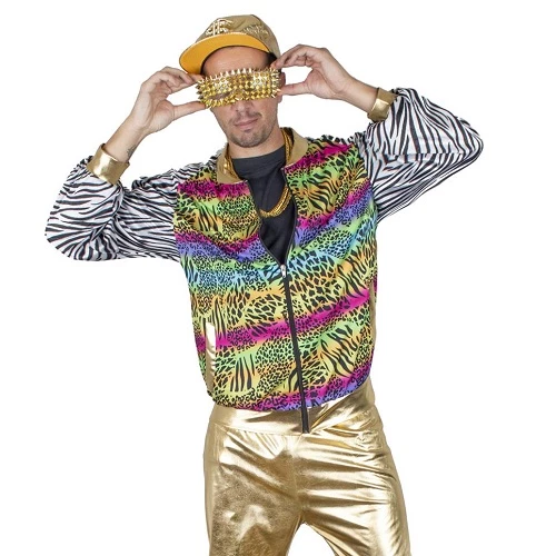 Super tof 90ties rave trainingsjasje met verschillende dierenprintjes en gouden details. Super fout en leuk voor een jaren 90 feestje. Verkrijgbaar in verschillende maten.
