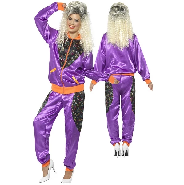 Geweldig 80ties of 90ties trainingspak in het paars en met een goede foute print op de borst en heupen. Het trainingspak is verkrijgbaar in verschillende maten.