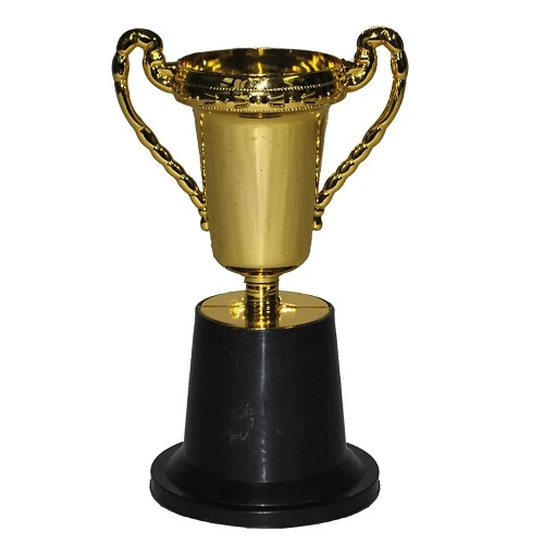 Plastic gouden trofee of prijsbeker op een zwart voetje. De trofee is 14cm groot.