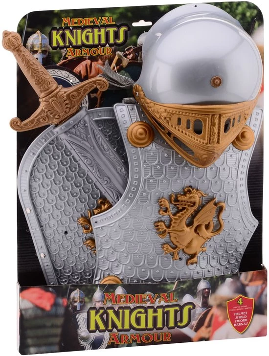 Mooie ridderset. Met een helm, zwaard, schild en borstschild. Allemaal in kindermaatjes.