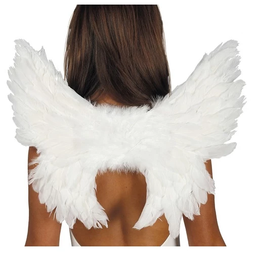 Witte engelenvleugels met veren. Om te doen door middel van brede elastieken die je om doet als een rugzak. De vleugels zijn 50x45cm.
