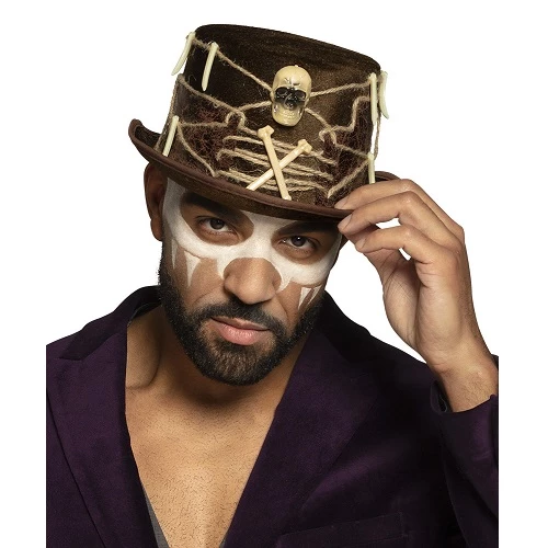 Mooie hoge hoed in het Voodoo thema. Bruin van kleur en afgewekt met touw, botten, nepleer en een schedeltje. One size, ongeveer hoofdmaat 59.